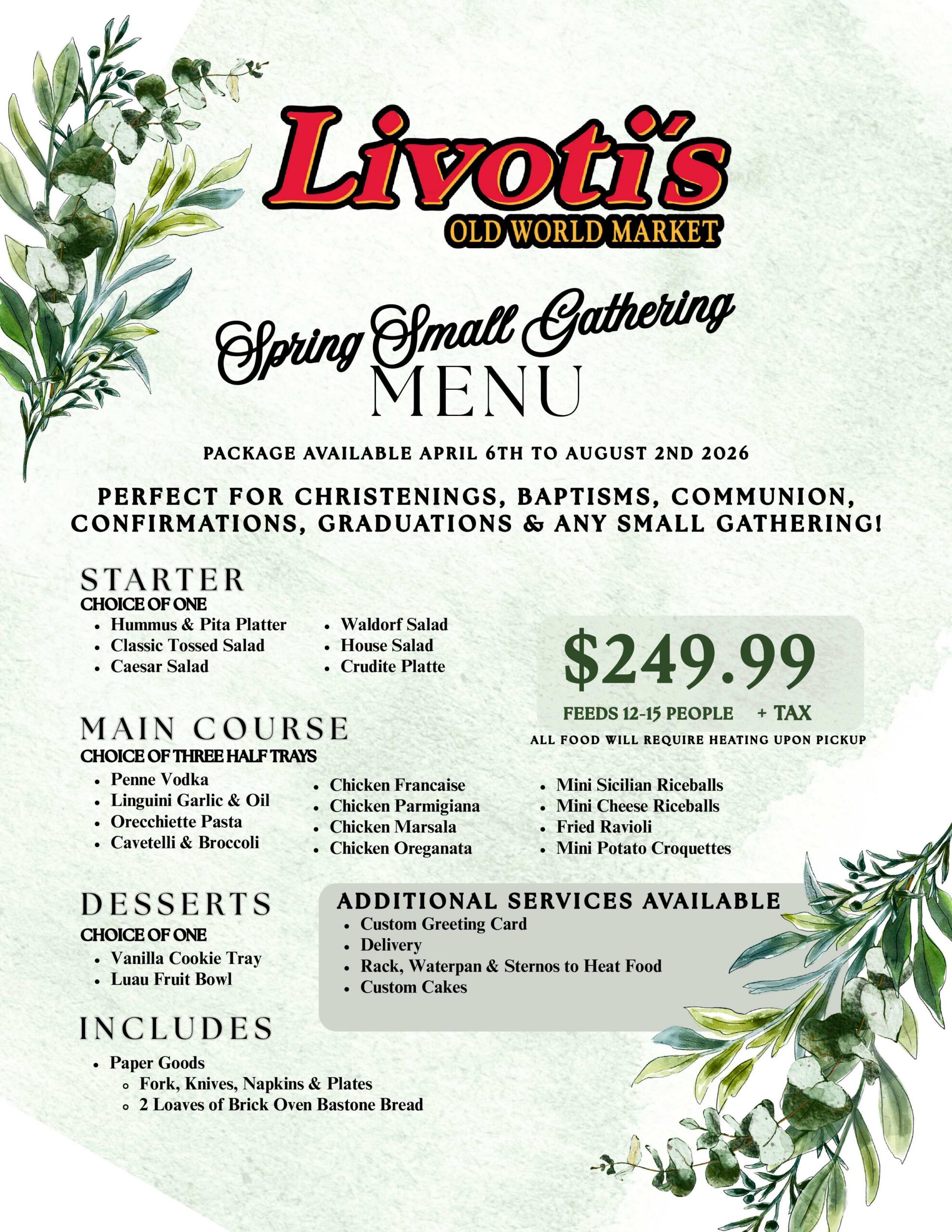 We have something for everyone at Livoti’s. You can always count on our everyday gourmet catering menu, which has been carefully crafted and designed so your next event is easy to plan and enjoy. Looking for something a bit more specific? Our seasonal menus are strategically created and ideal to make the busiest times of the year a little less stressful. From outdoor graduation parties to office holiday parties, we can do it all. Check out our latest menus below and feel free to reach out to us with any questions you have!